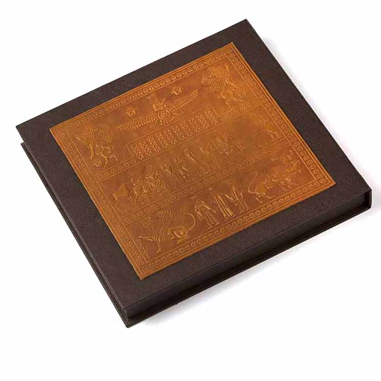 جلد کتاب از چرم طبیعی گاو ساخته شده و همین انتخاب، آن را در ردیف آثار هنری و مجموعهای قرار میدهد که حس اصالت، دوام و اصالت فرهنگی را در نگاه و لمس به مخاطب منتقل میکند.