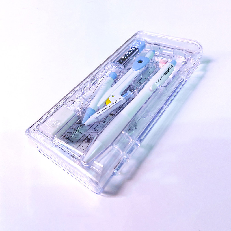 اقلام همراه : این ست شامل یک اتود، پاککن، نوک مداد نوکی 0.7، خط کش، گونیا در دو سایز 45 درجه و 90 درجه و نقاله است.
